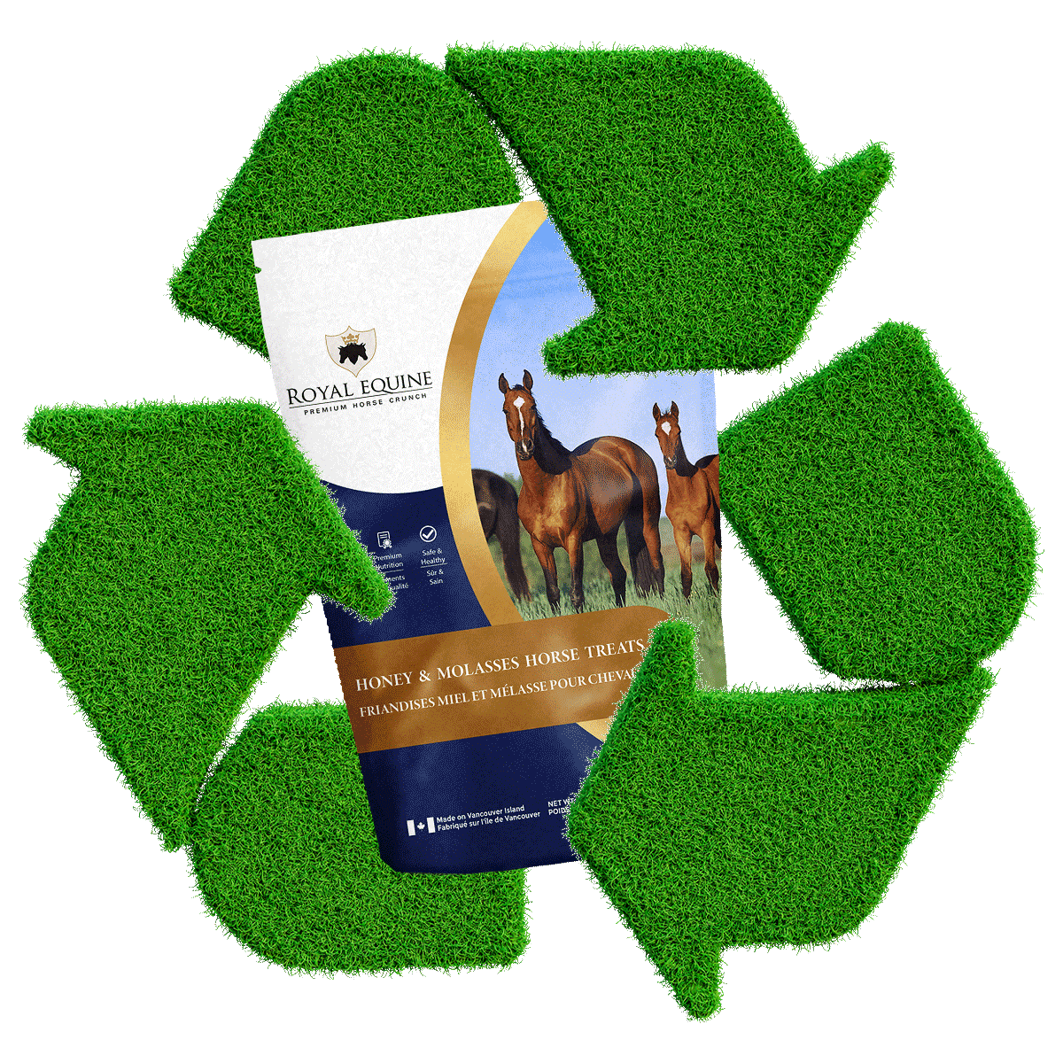 All Royal Equine treats are packaged in 100% recyclable, Canadian-made packaging. Made with 100% HDPE – Recycling #2 Plastic – our zipper-sealed pouches can be recycled in your municipal blue bin or an in-store soft plastic recycling program, depending where you live. The recycled pouches are chipped into pellets to create post-consumer plastic materials and the cycle continues. Here's to building a circular economy and no more landfills!